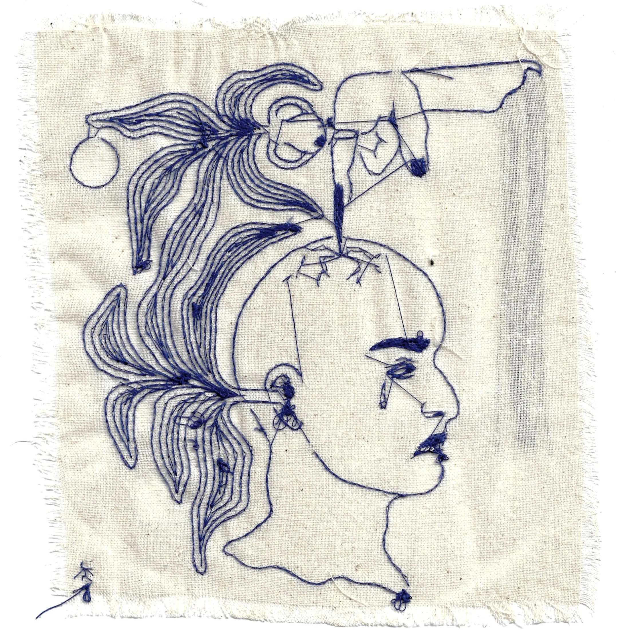1 BRODERIE AU FIL BLEU SUR TISSU, 16X17CM
